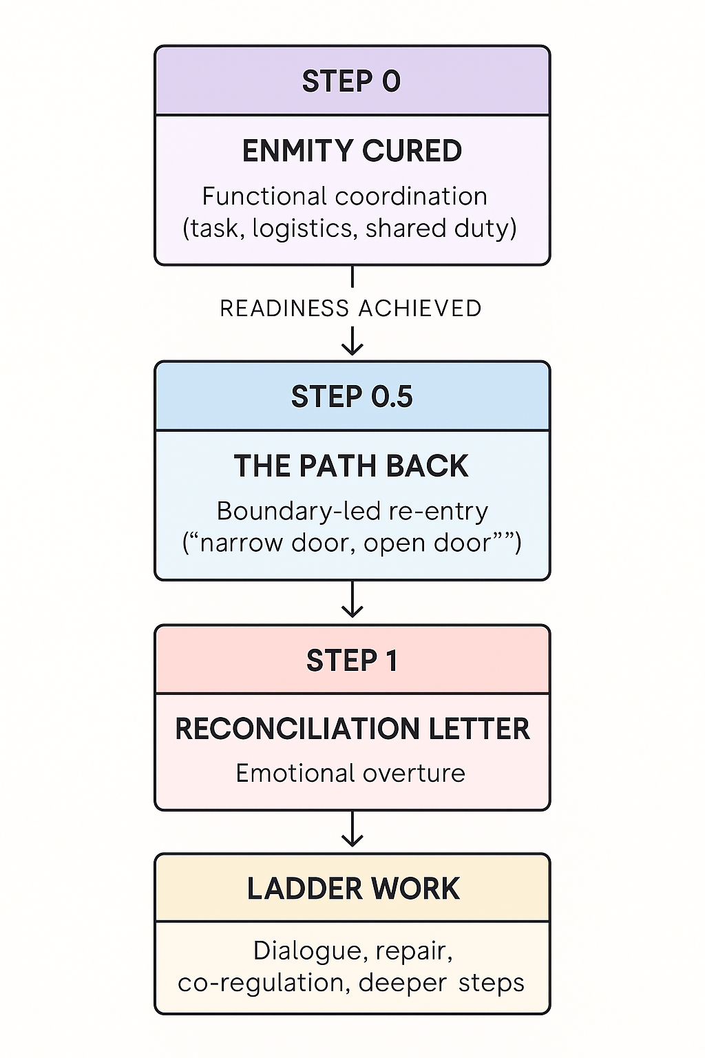 Coleman begins at the moment when a parent is ready to send a reconciliation letter or when an adult child has softened enough to allow emotional material. Demir’s Step 0 (Enmity Cured + The Path Back) addresses the structural gap before that point: creating safe, functional pre-contact for therapy-resistant or shame-sensitive dyads.