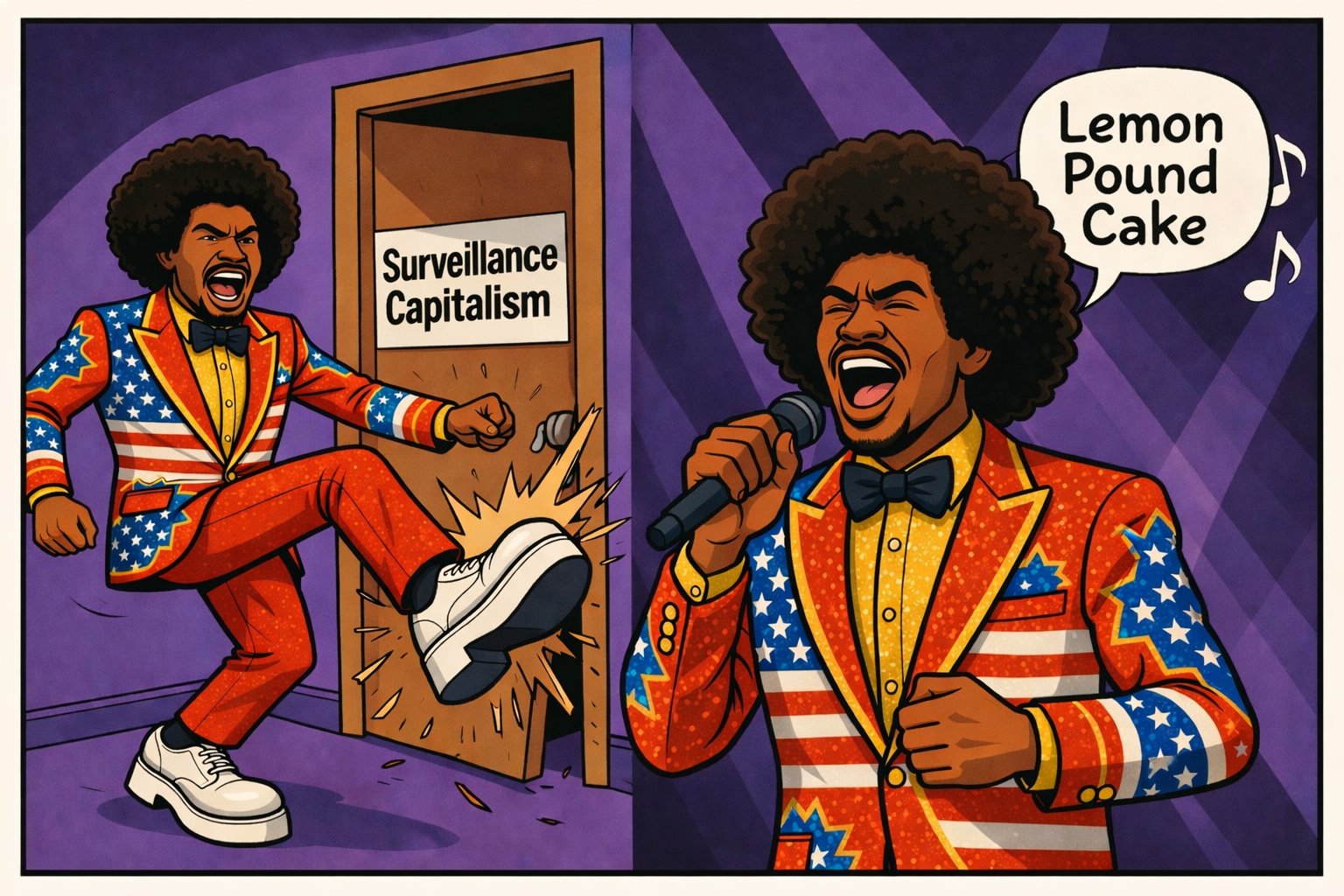 The image that remains is comic and exact: Afroman kicking in the door of surveillance capitalism in white platform shoes, then breaking into song, singing Lemon Pound Cake.