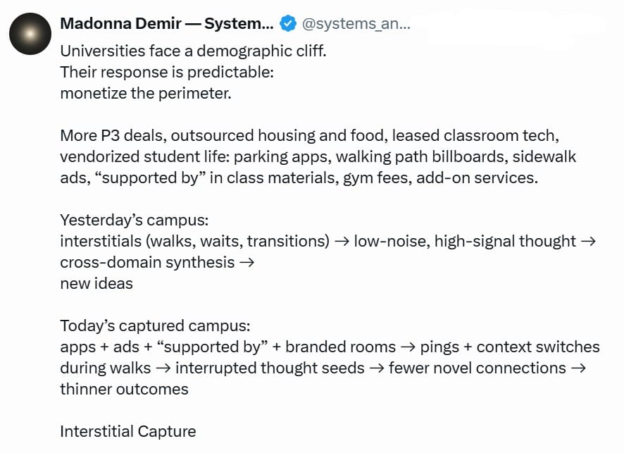 Universities facing a demographic cliff are monetizing the perimeter through P3 deals, vendorized student life, and campus advertising. The hidden cost is cognitive: when interstitial spaces become attention surfaces, cross domain synthesis collapses quietly.